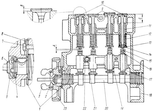 Установите распределительный валик вверх шестерней в тисках с бедными губками. Расшплинтуйте и отверните корончатые гайки 2 осей грузиков регулятора. Выньте оси и снимите грузики 3. Отогните усик стопорной шайбы 5 из шлицев гайки 6. Отверните гайку и спрессуйте с валика шестерню 23 съемником.