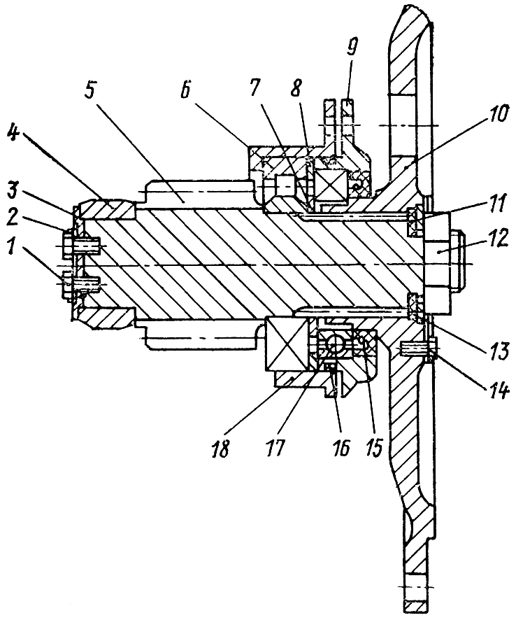 Наденьте на корпус 10 резиновое кольцо 7. Вставьте в корпус стержень 5 и запрессуйте шарикоподшипник 11 до упора в бурт корпуса. Запрессуйте наружное кольцо роликоподшипника 9 до упора в шарикоподшипник. Установите собранный корпус подшипника в гнездо корпуса бортовых фрикционов до упора во фланец. Закрепите фиксатор 6 к корпусу бортовых фрикционов четырьмя болтами 12 со. стопорными шайбами.