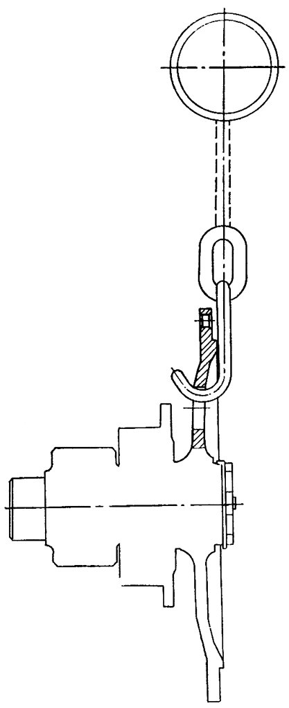 Нагрейте в масляной ванне внутренние кольца роликоподшипников 6 и 7 до температуры 363 К (90°С) и напрессуйте на шейки двойной шестерни 1. Разукомплектовка колец подшипников не допускается. Внутренние и наружные кольца должны иметь одинаковую маркировку. Соедините с подъемником двойную шестерню захватом ( см. рис. 259. ) и установите внутренним кольцом роликоподшипника со стороны большой шестерни в наружное кольцо с роликами и введите шестерни в зацепление.