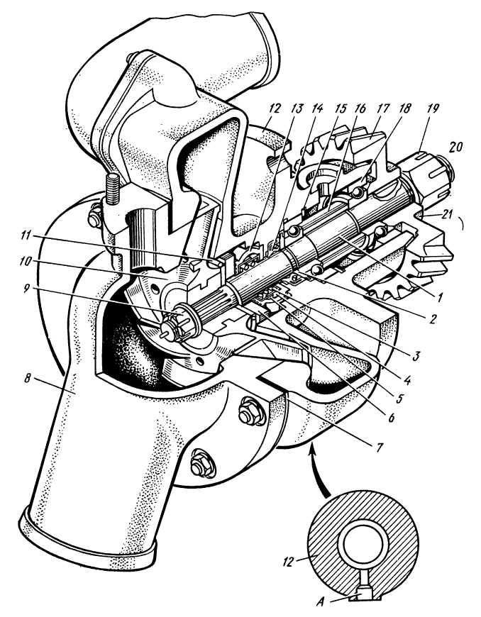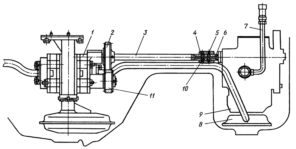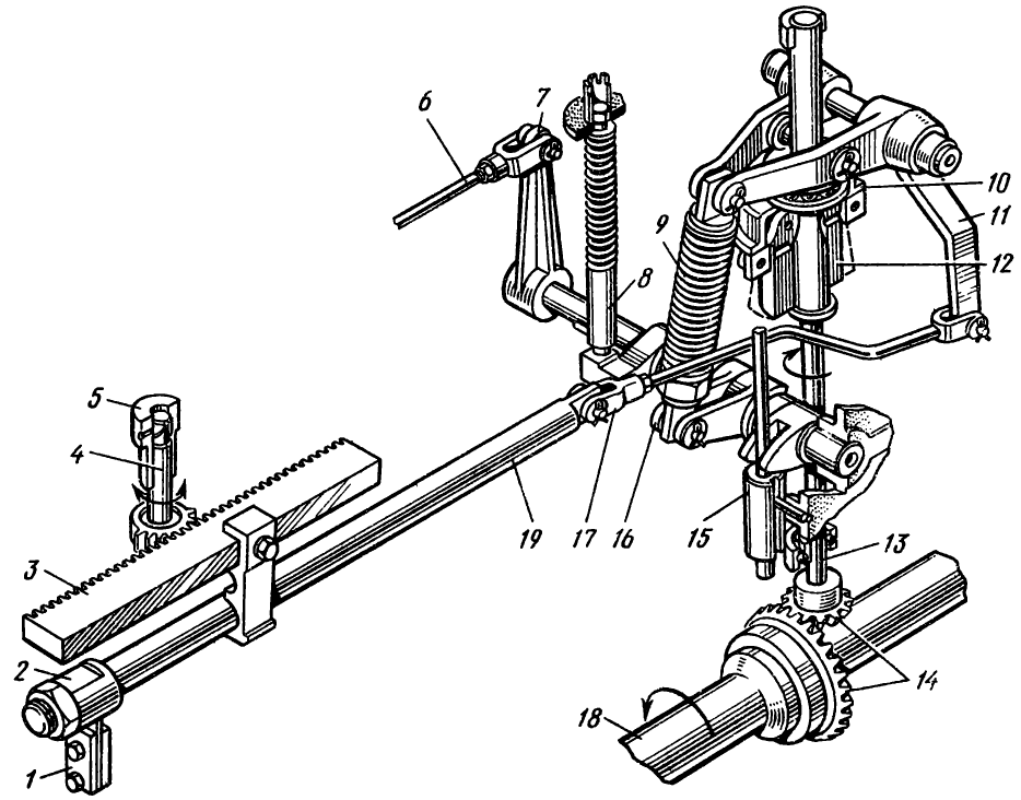 Регулирующая муфта при этом должна соприкасаться с пружиной корректора без деформации пружины (подложить под пружину щуп толщиной 2,8 мм для двигателя Д-160 и 3,6 мм — для двигателя Д-160Б); грузики регулятора прижаты к вертикальному валику, а подвижная муфта регулятора — к роликам рычагов (торец муфты не должен доходить до сухариков грузиков на 1,5—3 мм).